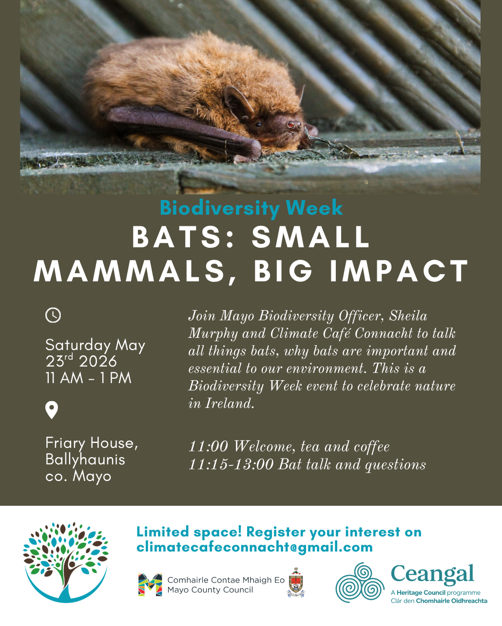 Join Mayo Biodiversity Officer, Sheila Murphy and Climate Café Connacht to talk all things bats why bats are important and essential to our environment. This is a Biodiversity Week event to celebrate nature in Ireland.