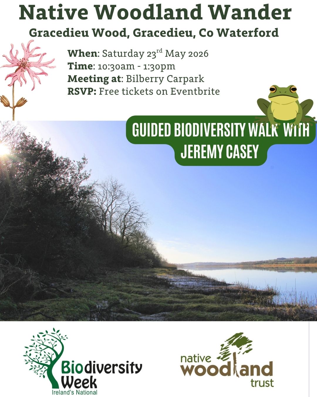 Free family Biodiversity Week workshop at Rinnagan Wood: explore native trees, make art tools from nature and draw what you discover. 🌿 Drawing from the Woods A Biodiversity Week Family Art & Nature Workshop As part of National Biodiversity Week 2026, join the Native Woodland Trust and local artists for a gentle, creative day in the...